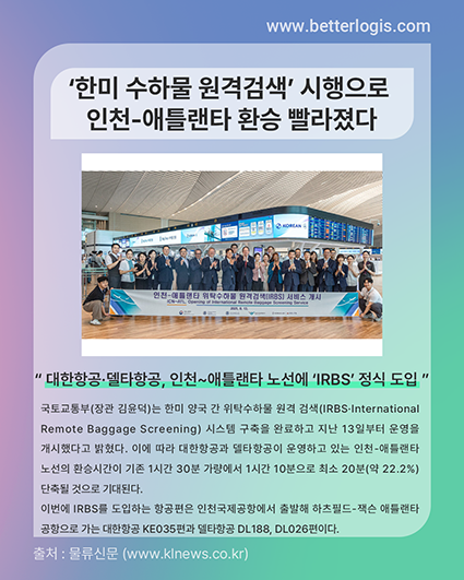 국토교통부(장관 김윤덕)는 한미 양국 간 위탁수하물 원격 검색(IRBS·International Remote Baggage Screening) 시스템 구축을 완료하고 지난 13일부터 운영을 개시했다고 밝혔다. 이에 따라 대한항공과 델타항공이 운영하고 있는 인천-애틀랜타 노선의 환승시간이 기존 1시간 30분 가량에서 1시간 10분으로 최소 20분(약 22.2%) 단축될 것으로 기대된다.