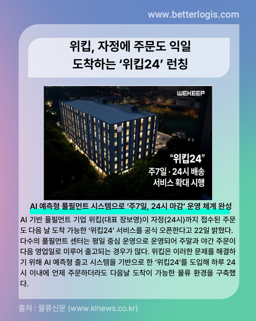 다수의 풀필먼트 센터는 평일 중심 운영으로 운영되어 주말과 야간 주문이 다음 영업일로 미루어 출고되는 경우가 많다. 위킵은 이러한 문제를 해결하기 위해 AI 예측형 출고 시스템을 기반으로 한 ‘위킵24’를 도입해 하루 24시 이내에 언제 주문하더라도 다음날 도착이 가능한 물류 환경을 구축했다.