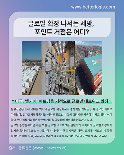 글로벌 종합물류기업 세방 또한 글로벌 네트워크를 탄탄하게 구축하며 글로벌 시장에서 입지를 확대해가고 있는 기업 중 하나이다. 현재 세방은 미국, 벨기에, 베트남 세 곳을 중심으로 북미, 유럽, 아시아 시장에서 글로벌 물류기업으로서의 기반을 쌓아가고 있다.