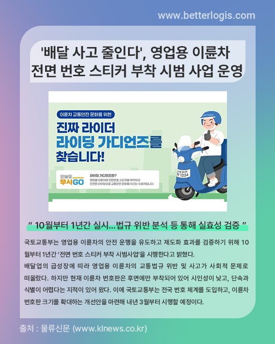 국토교통부는 영업용 이륜차의 안전 운행을 유도하고 제도화 효과를 검증하기 위해 10월부터 1년간 ‘전면 번호 스티커 부착 시범사업’을 시행한다고 밝혔다.