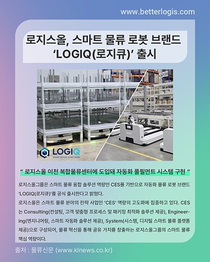 로지스올그룹은 스마트 물류 융합 솔루션 역량인 CES를 기반으로 자동화 물류 로봇 브랜드 ‘LOGIQ(로지큐)’를 공식 출시한다고 밝혔다.