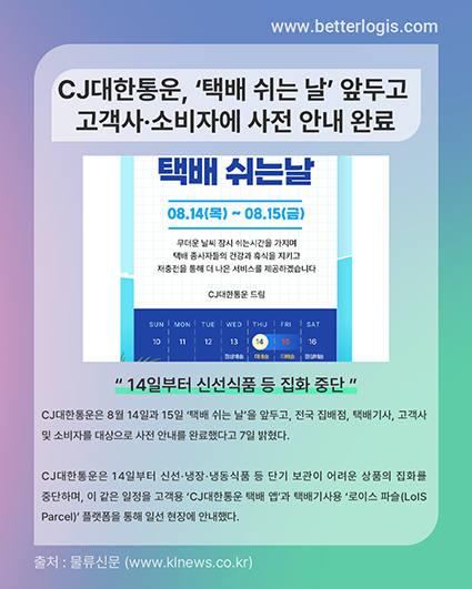 CJ대한통운은 8월 14일과 15일 ‘택배 쉬는 날’을 앞두고, 전국 집배점, 택배기사, 고객사 및 소비자를 대상으로 사전 안내를 완료했다고 7일 밝혔다.
