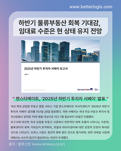 젠스타메이트 리서치센터 관계자는 “오피스•물류센터 등 상업용 부동산 시장이 전반적인 회복 흐름을 보이고 있지만, 리테일 섹터는 여전히 어려움을 겪는 등 섹터별로 뚜렷한 차별화가 나타나고 있다”며 “지역별•자산별 선별적 투자 전략이 필요한 시기”고 밝혔다.