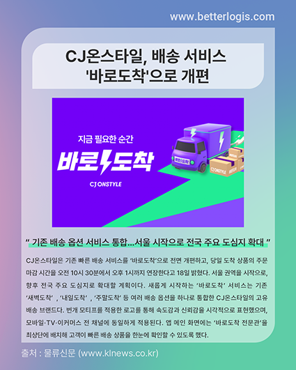 새롭게 시작하는 ‘바로도착’ 서비스는 기존 ‘새벽도착’, ‘내일도착’, ‘주말도착’ 등 여러 배송 옵션을 하나로 통합한 CJ온스타일의 고유 배송 브랜드다. 번개 모티프를 적용한 로고를 통해 속도감과 신뢰감을 시각적으로 표현했으며, 모바일·TV·이커머스 전 채널에 동일하게 적용된다. 앱 메인 화면에는 ‘바로도착 전문관’을 최상단에 배치해 고객이 빠른 배송 상품을 한눈에 확인할 수 있도록 했다.CJ온스타일은 올해 상반기 수도권 중심이던 빠른 배송 인프라를 전국으로 확장하고, 주 7일 배송 체계를 본격 가동한 결과 상품 익일 도착률을 71%까지 끌어올렸다. 이번 개편을 통해 빠른 배송에 대한 고객 수요에 부응하고, 배송 경험 등 브랜드 핵심 자산을 더욱 강화할 것으로 기대하고 있다.CJ온스타일 관계자는 “빠른 배송을 단순 속도 경쟁이 아닌, 프리미엄 상품까지 아우르는 차별화된 커머스 경험으로 만들겠다” 며 “콘텐츠·상품·빠른 배송이 유기적으로 연결된 CJ온스타일만의 새로운 쇼핑 스탠다드를 확립하고, 독보적인 물류 경쟁력을 강화해 나갈 것”이라고 밝혔다.