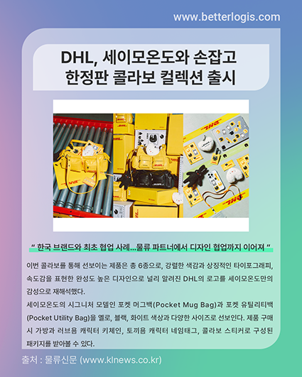 DHL은 한국 컨템포러리 가방 브랜드 ‘세이모온도(SAMO ONDOH)’와 손잡고 한정판 콜라보레이션 컬렉션을 출시한다고 밝혔다. 이는 DHL이 한국 브랜드와 협업하는 첫 사례로, 세이모온도는 DHL의 글로벌 네트워크를 통해 해외 소비자에게 제품을 배송하는 고객이다.