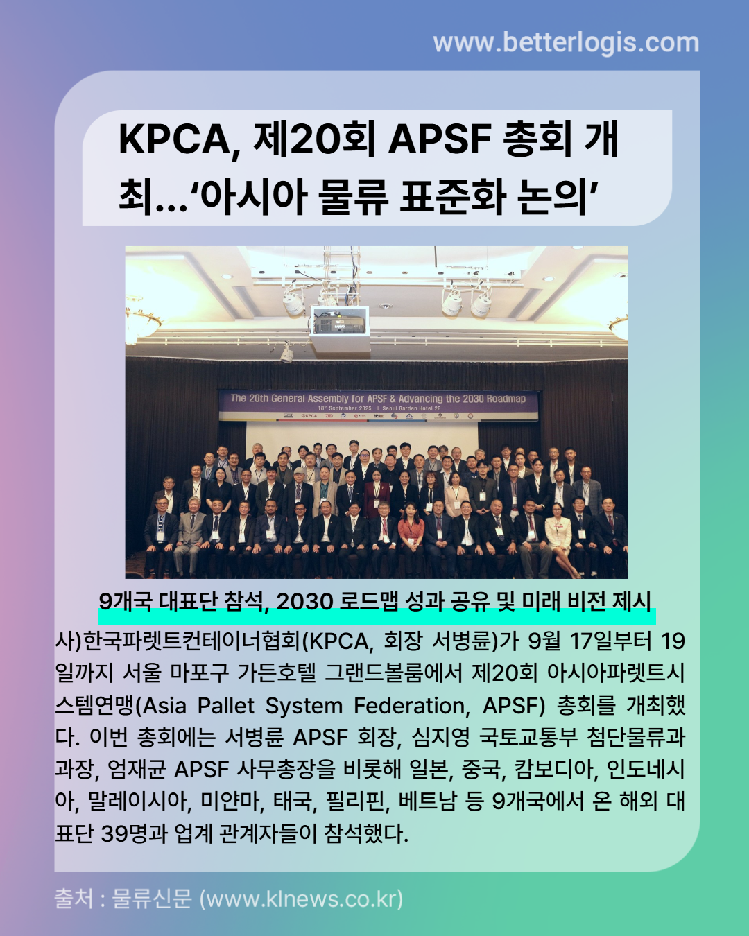 (사)한국파렛트컨테이너협회(KPCA, 회장 서병륜)가 9월 17일부터 19일까지 서울 마포구 가든호텔 그랜드볼룸에서 제20회 아시아파렛트시스템연맹(Asia Pallet System Federation, APSF) 총회를 개최했다.