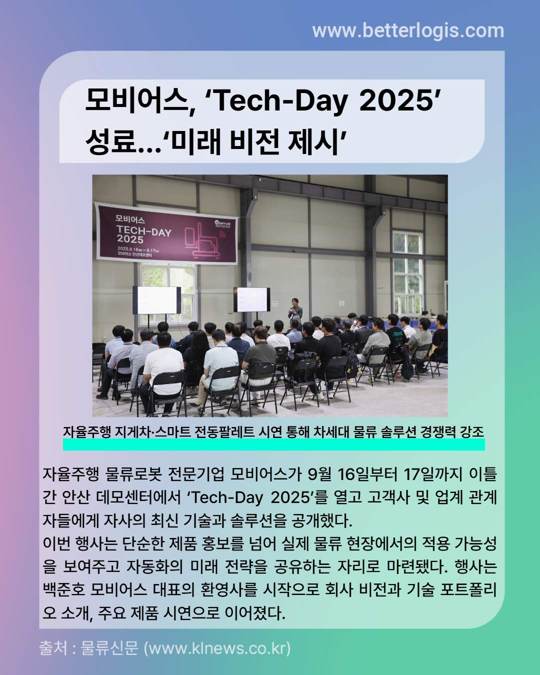 자율주행 물류로봇 전문기업 모비어스가 9월 16일부터 17일까지 이틀간 안산 데모센터에서 ‘Tech-Day 2025’를 열고 고객사 및 업계 관계자들에게 자사의 최신 기술과 솔루션을 공개했다.