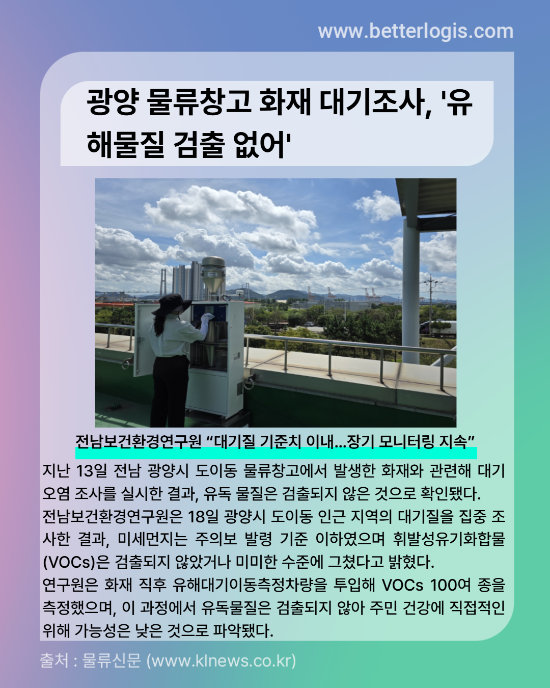 지난 13일 전남 광양시 도이동 물류창고에서 발생한 화재와 관련해 대기 오염 조사를 실시한 결과, 유독 물질은 검출되지 않은 것으로 확인됐다.