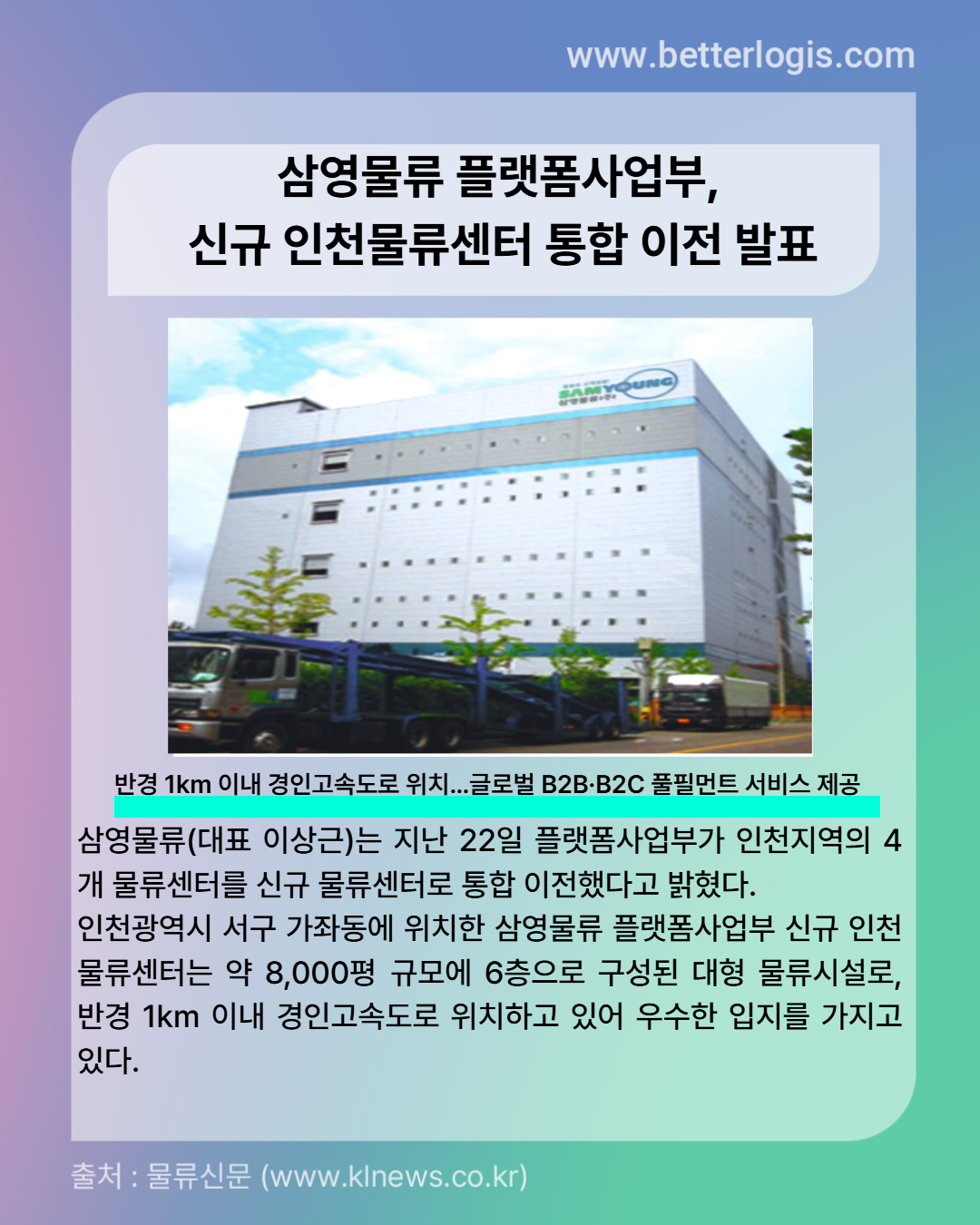 인천광역시 서구 가좌동에 위치한 삼영물류 플랫폼사업부 신규 인천물류센터는 약 8,000평 규모에 6층으로 구성된 대형 물류시설로, 반경 1km 이내 경인고속도로 위치하고 있어 우수한 입지를 가지고 있다.