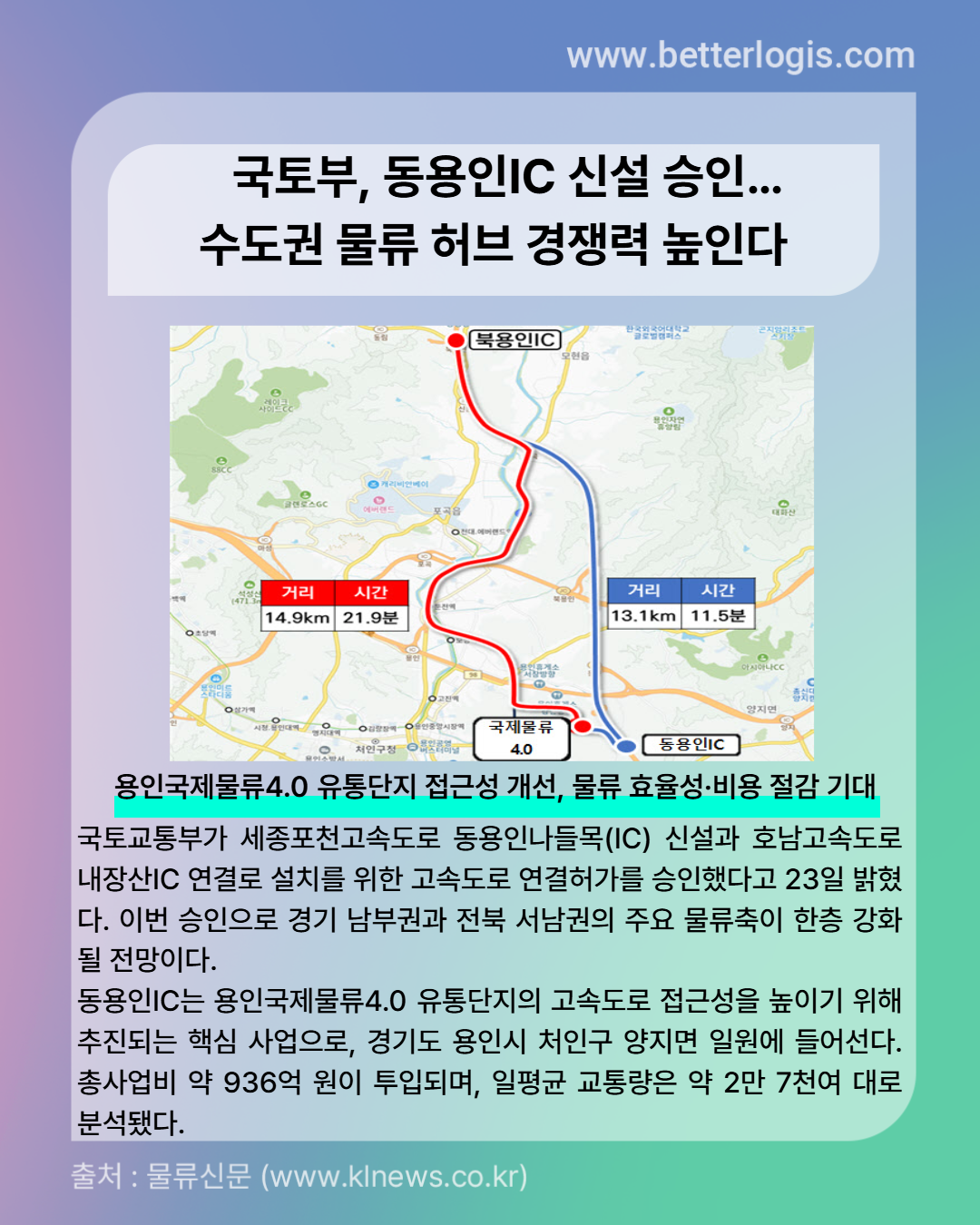 IC가 개통되면 용인국제물류 4.0 유통단지와 서울 간 이동거리가 최대 2km, 이동시간은 약 10분 단축될 것으로 예상된다. 이는 물류 운송 효율을 크게 높이고 기업의 운송비 절감 효과로 이어질 전망이다.