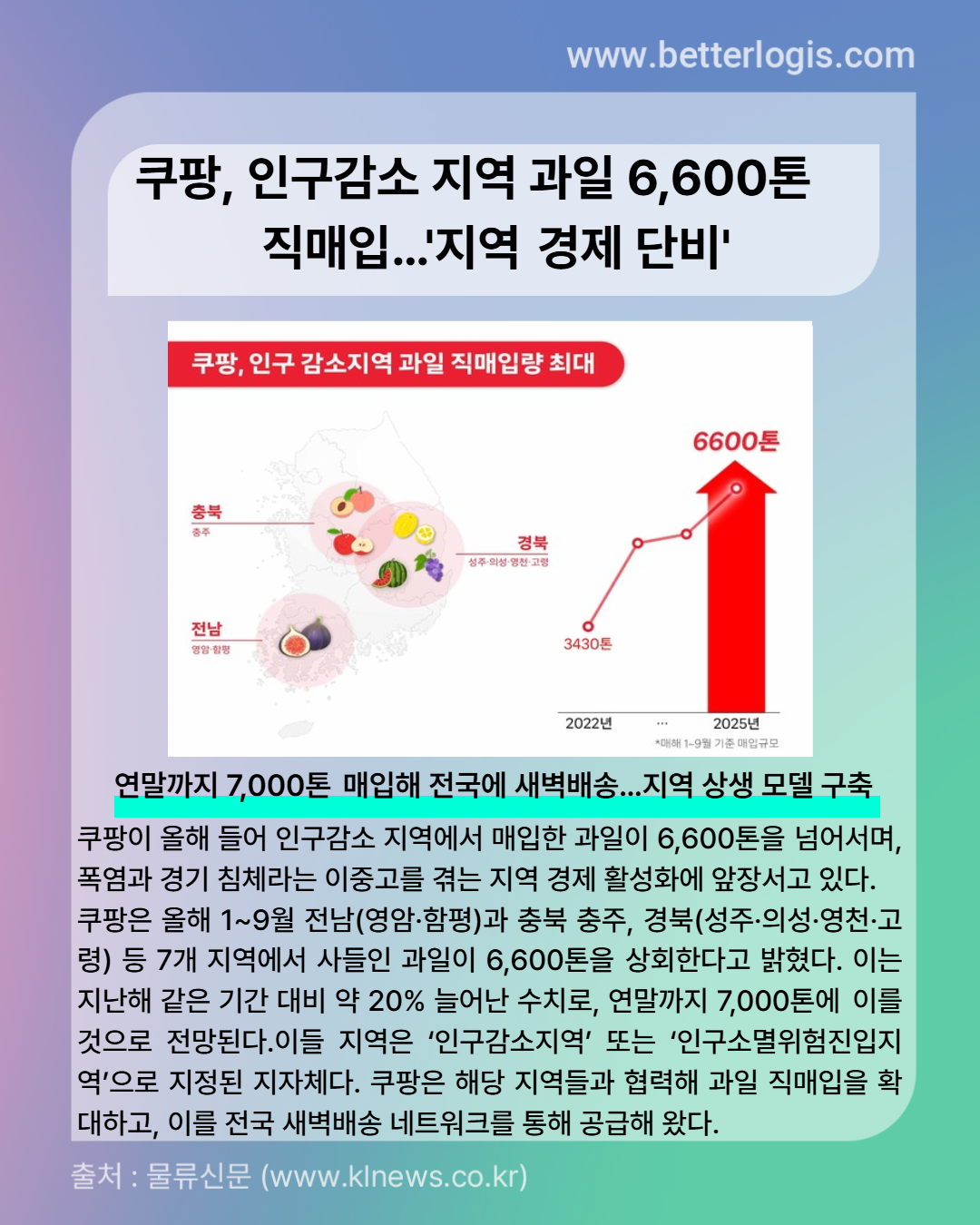 이들 지역은 ‘인구감소 지역’ 또는 ‘인구 소멸 위험 진입 지역’으로 지정된 지자체다. 쿠팡은 해당 지역들과 협력해 과일 직매입을 확대하고, 이를 전국 새벽 배송 네트워크를 통해 공급해 왔다.