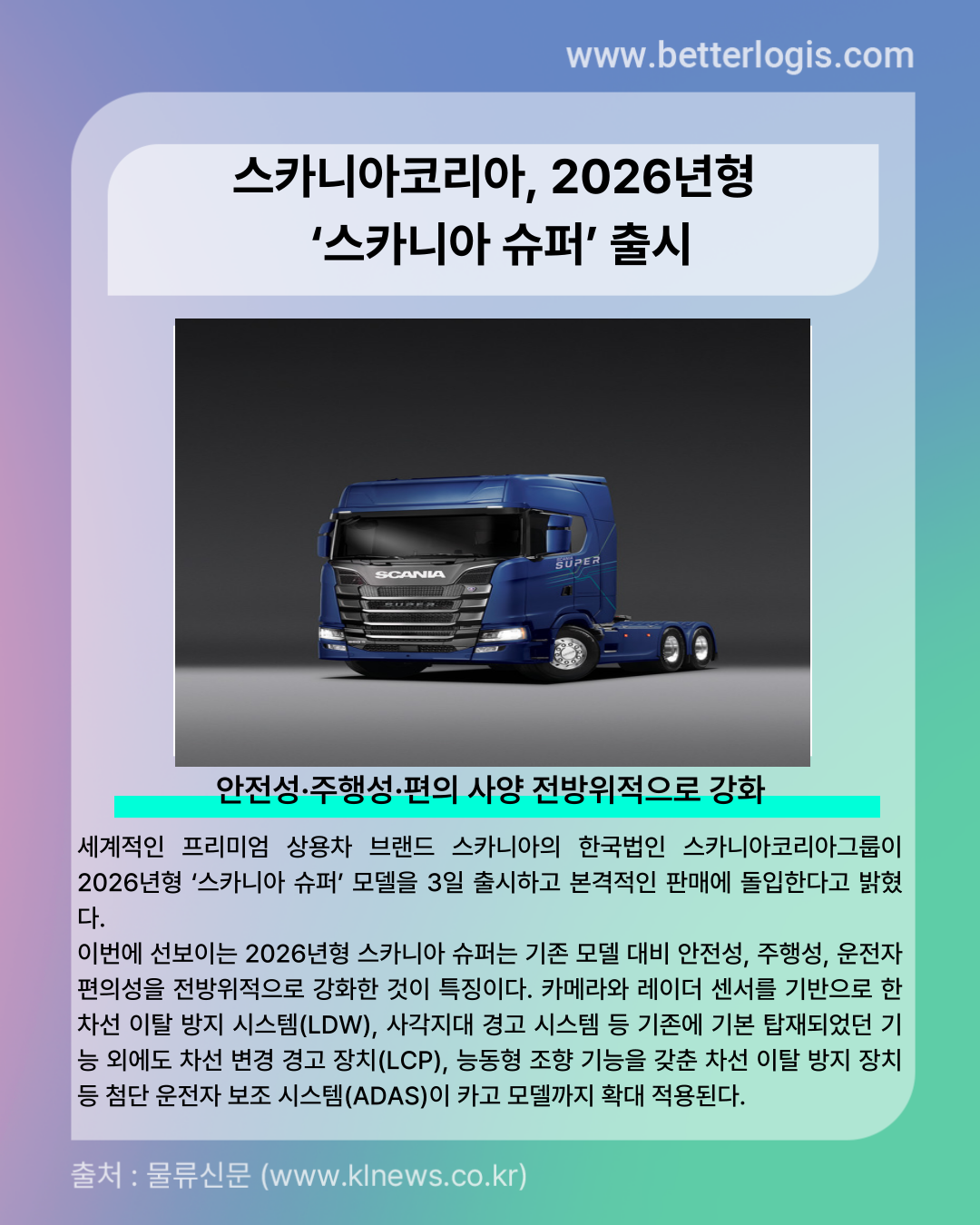 스카니아코리아그룹 에카테리나 에르몰렌코바 대표는 “2026년형 스카니아 슈퍼는 첨단 기술을 통해 운전자뿐만 아니라 도로 위 모든 이용자를 보호하고, 더 나은 주행 경험을 제공하도록 업그레이드 됐다.”며 “또한 차량 성능을 최적화하고 운송 효율성을 극대화하는 다양한 서비스 솔루션을 차량과 함께 제공해 고객의 비즈니스 경쟁력과 지속가능한 운송의 미래를 함께 만들어 가겠다.”라고 밝혔다.