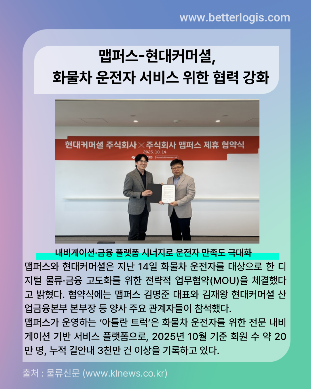 김명준 맵퍼스 대표는 “이번 협업은 양사 플랫폼 간 시너지를 통해 화물차 운전자의 일상에 실질적인 가치를 더할 수 있다는 점에서 의미가 크다”며 “앞으로도 맵퍼스가 오랫동안 축적해온 화물차 주행 데이터와 기술력을 바탕으로 화물차 운전자의 업무 효율과 생활 편의를 높이는 디지털 혁신을 이어가겠다”고 말했다.