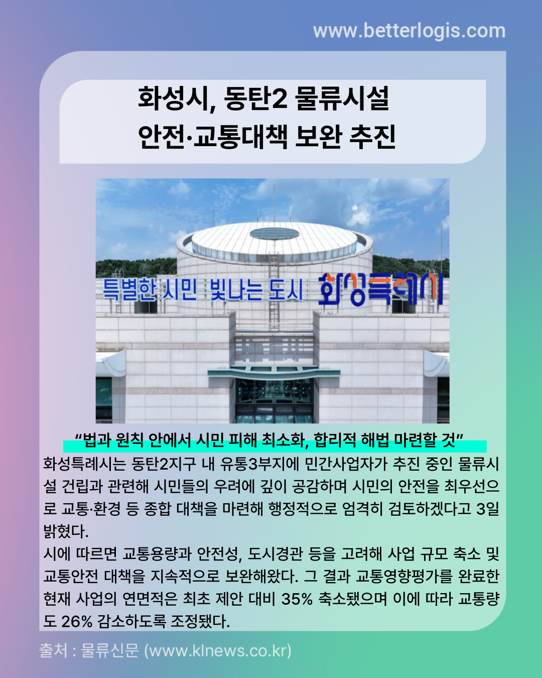 정명근 화성특례시장은 “대형 물류시설 건립에 대한 시민들의 우려를 충분히 인식하고 있다”며 “법적 절차 안에서 가능한 모든 방안을 검토해 피해를 최소화하고 시민과 함께 합리적인 해법을 찾아가겠다”고 말했다.