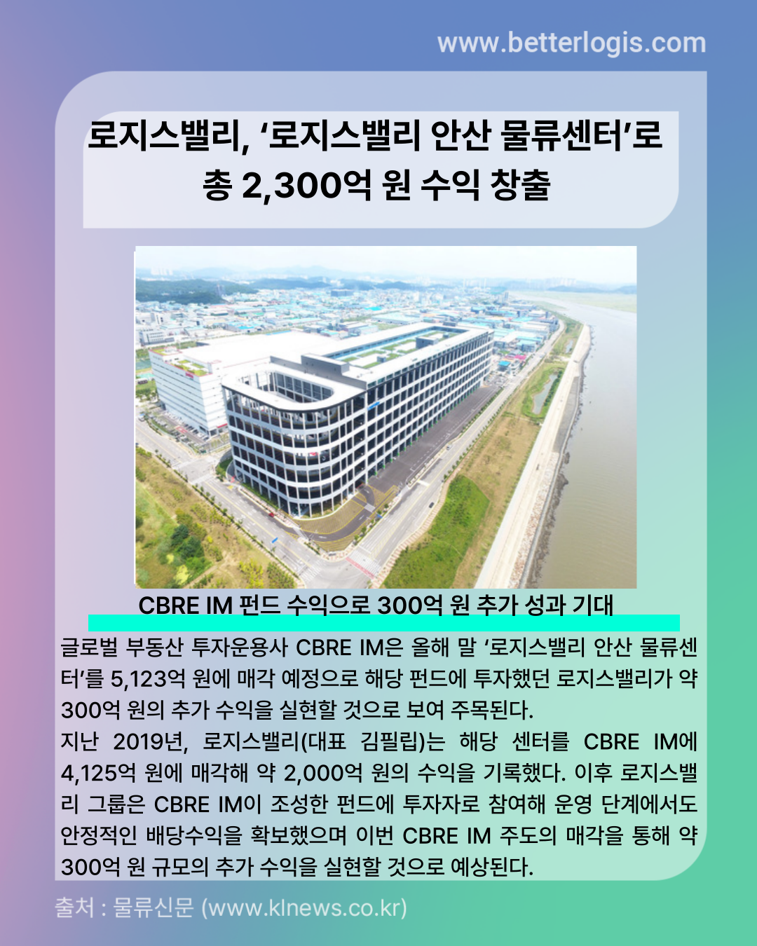 글로벌 부동산 투자운용사 CBRE IM은 올해 말 ‘로지스밸리 안산 물류센터’를 5,123억 원에 매각 예정으로 해당 펀드에 투자했던 로지스밸리가 약 300억 원의 추가 수익을 실현할 것으로 보여 주목된다.